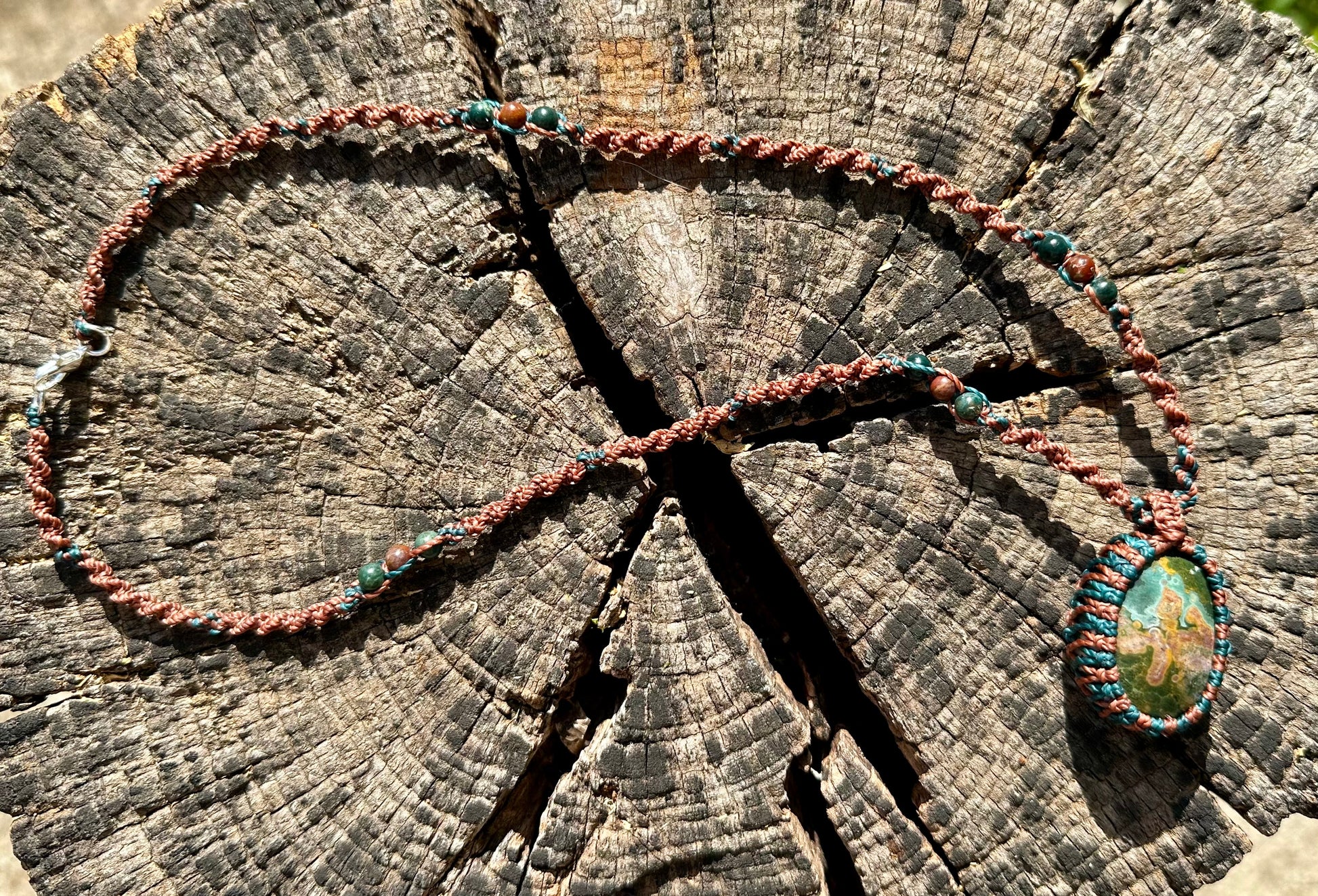 This handcrafted necklace features a polished Ocean Jasper pendant secured in a durable, intricately braided holder. The 18-inch strand is woven with complementary Ocean Jasper beads, creating a cohesive, earthy design inspired by natural coastal tones.